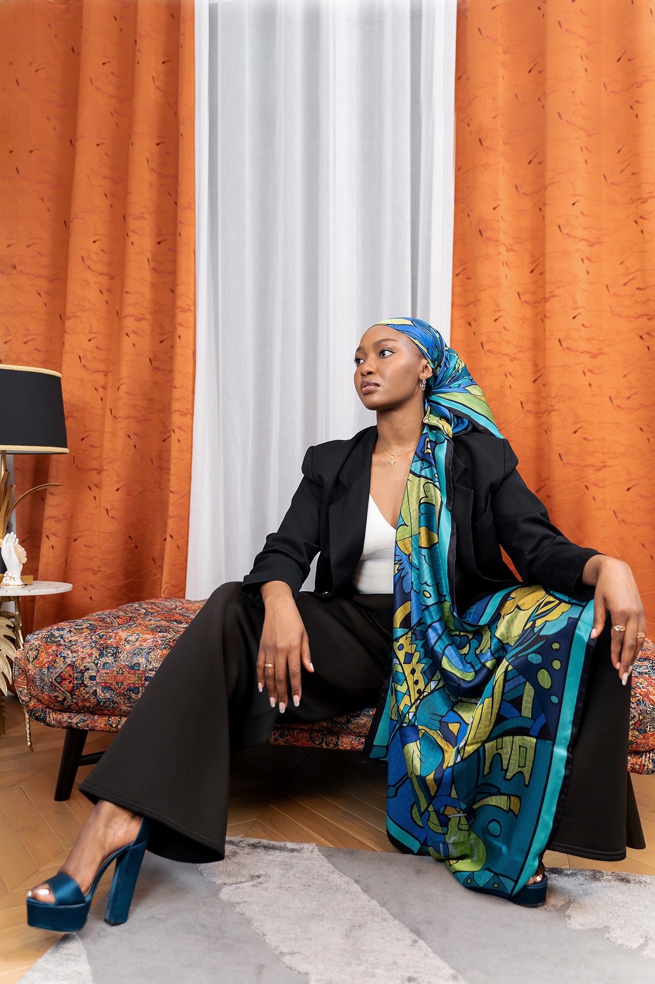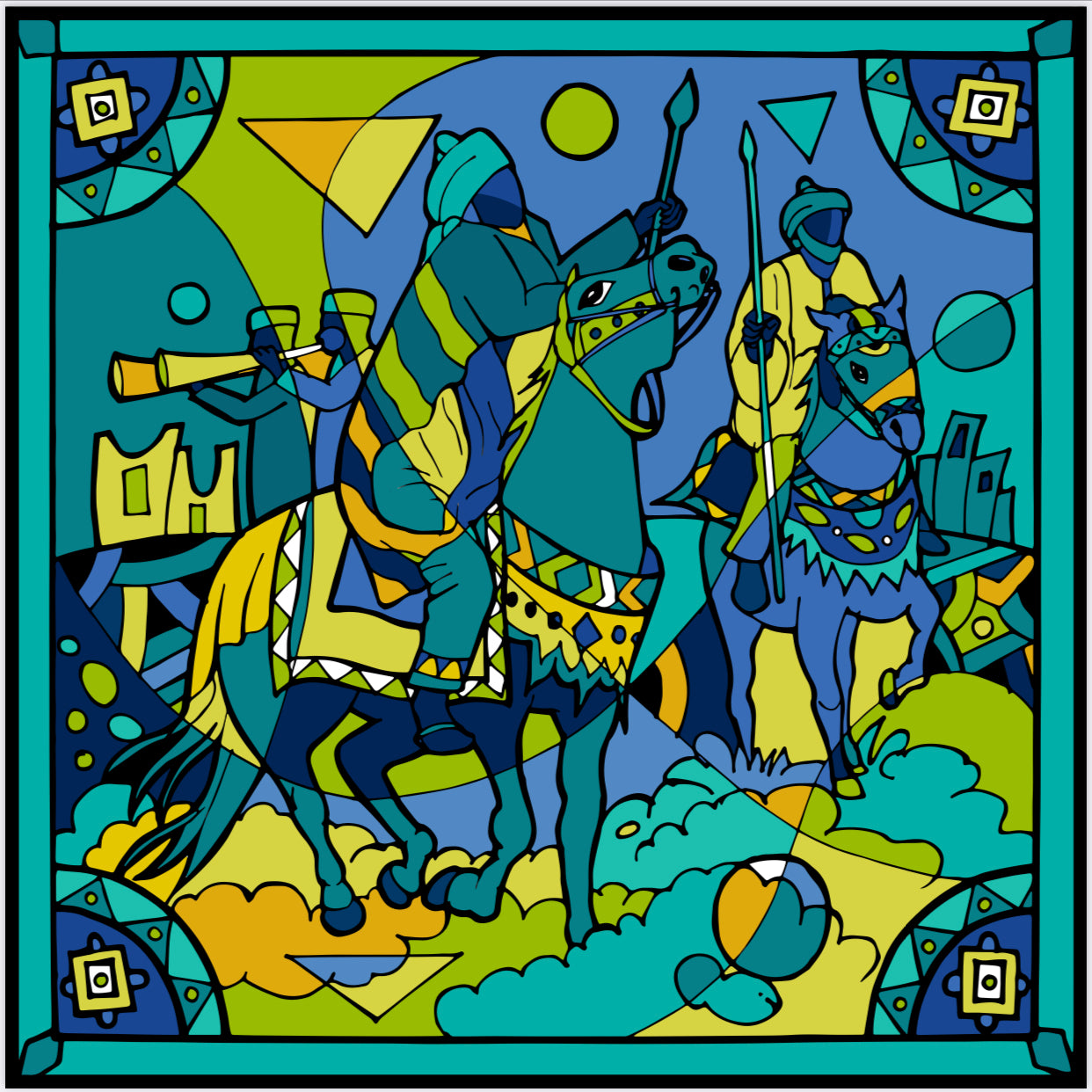 This piece depicts the Durbar festival in the Sahel. The shapes and patterns are deeply rooted in northern Nigeria's culture. So are the architecture, the outfits, the traditional music instruments and weapons. The spirit and grandeur of the event is obvious through the style of the designer and his use of vibrant colors.
